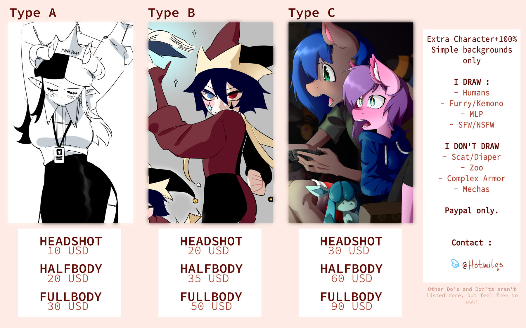 "Do's and Don'ts" will be added another day ;w;If everything looks good, feel free to contact me on my Discord or Twitter! ( @hotmilqs ) !